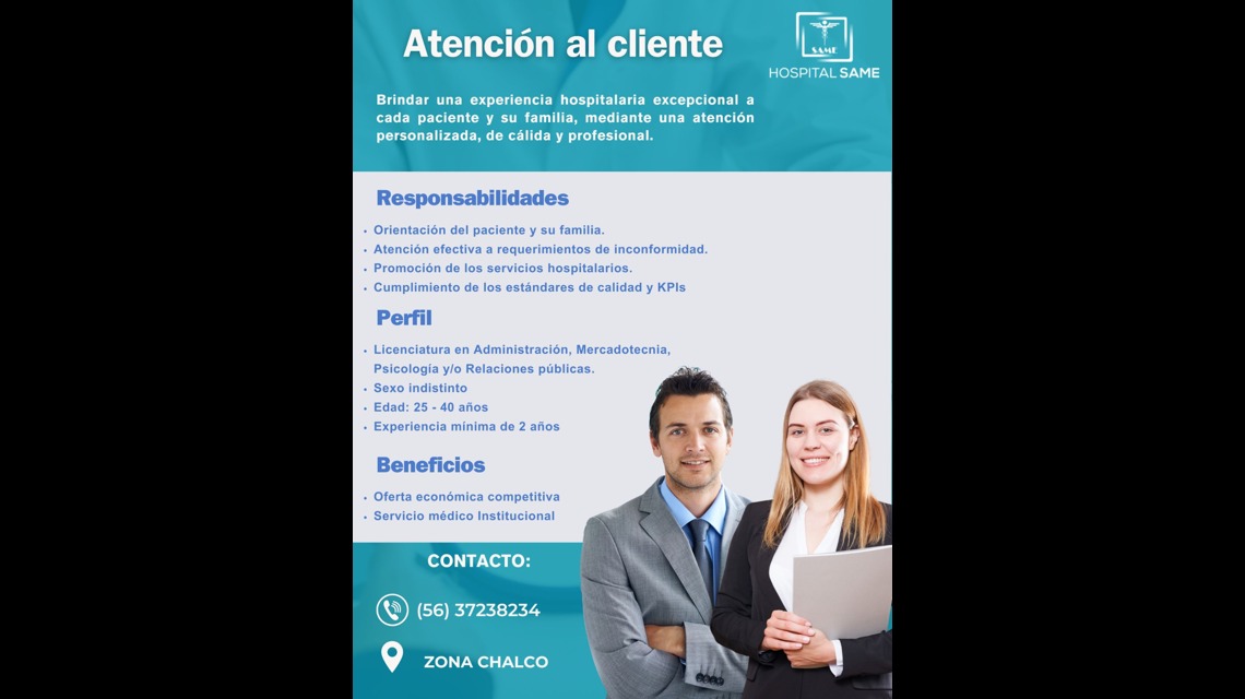 Hospital SAME, se encuentra en búsqueda psicólogo/a para cubrir la posición ejecutiva de atención al cliente que pueda brindar una experiencia hospitalaria excepcional, humana y personalizada a cada paciente y su familia, desde el ingreso hasta el egreso, a través de una atención cálida, eficiente y profesional que genere confianza y fidelización.